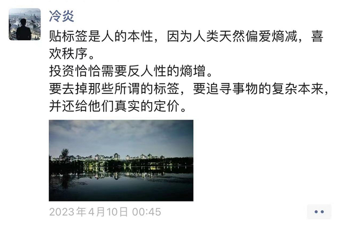 徐彦认为,人的语言和思维有很大的局限性,价值投资、赛道、护城河等都是标签,人们经常给复杂事物贴上一个简单标签,这种方式与其说有助于大家思考,不如说是掩盖问题的复杂性,让更多人失去思考能力。