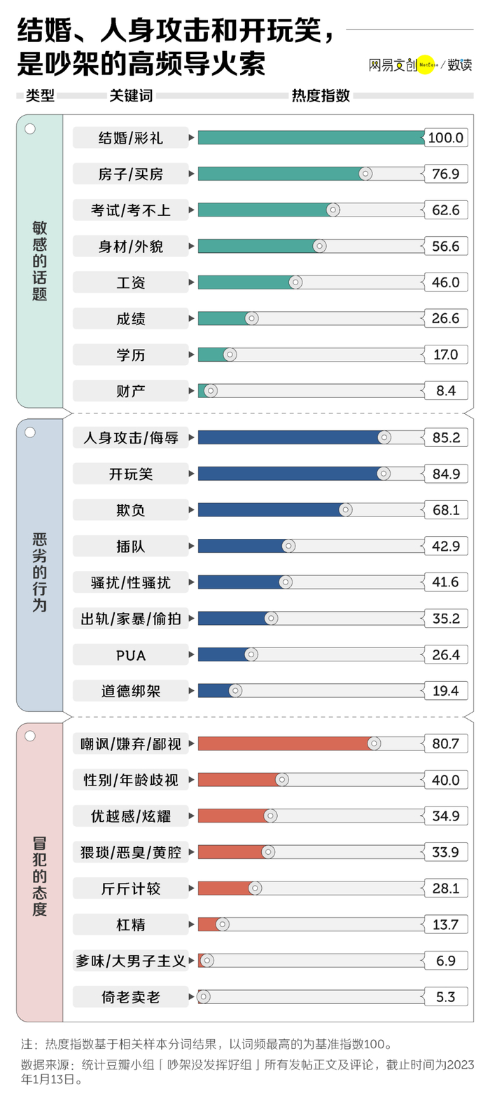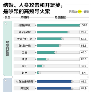 让人“一点就燃”的引战关键词里,结婚/彩礼、人身攻击、开玩笑排名前三。