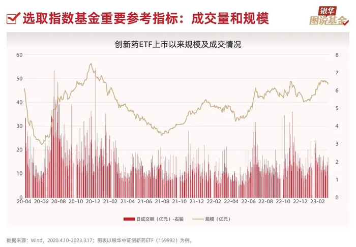 14、在选择指数基金时,成交量和规模也是重要的参考指标。在选择跟踪同一只指数的基金时,尽量不要选择规模太小的基金,规模越小越容易受到申赎的影响,从而影响跟踪误差。同样,也要注意成交量的大小,选择成交相对活跃、流动性较好的基金。
