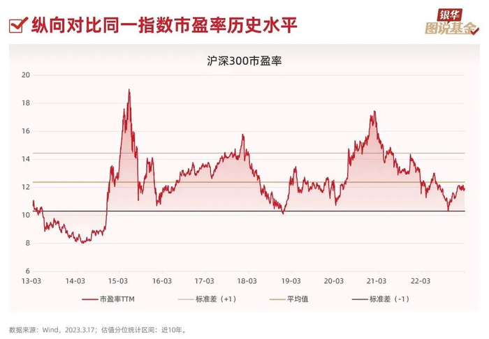 11、纵向,指同一指数市盈率历史水平的比较。通过了解目前指数估值所处百分位来判断,是否可能存在相对较好的买入机会。同样以沪深300指数为例,目前市盈率为11.91,处于近10年平均值以下,属于相对偏低的区间。