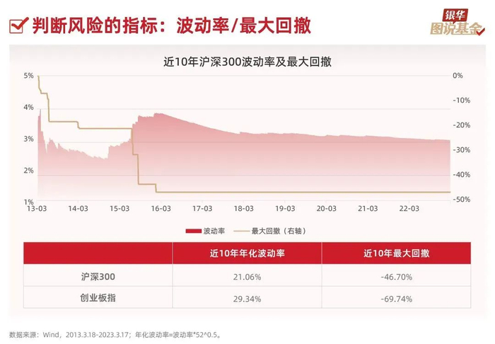 4、股票市场中的风险是多维度的,针对指数,我们常用的判断风险的指标为波动率和最大回撤。波动率是以指数一段时间收益率的标准差来表示,波动率越高,投资风险越大。最大回撤是指给定时间区间内指数最大的下跌幅度,表示投资后可能出现的最坏情况。