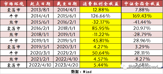 下图是各市场环境下消费红利全收益和中证全指全收益的情况,我们可以清晰看到红利指数在各种市场环境下均有较好的表现,在震荡市中表现也非常突出。