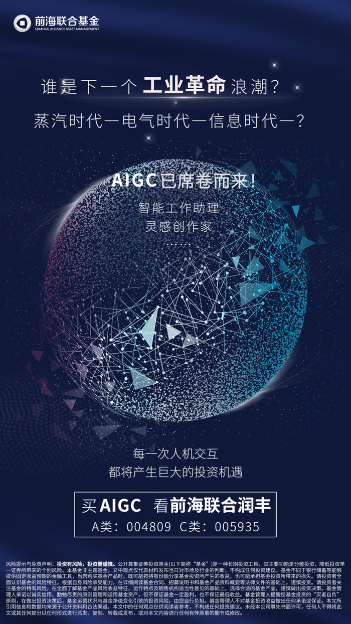 从前海联合润丰混合2023年一季报的持仓情况来看,基金经理熊钰也非常看好AIGC的算力及应用领域的投资机会。他在季报中表述:“AI 技术的发展对于人类社会的影响可能不亚于此前的工业革命和信息革命,对于生产效率的提升将带来长足的影响,也将加速此前设想的元宇宙等概念加速落地,本基金也重点加配了将直接受益于新技术的游戏、传媒等相关个股。”(注:基金持仓不表示现在及未来持仓)