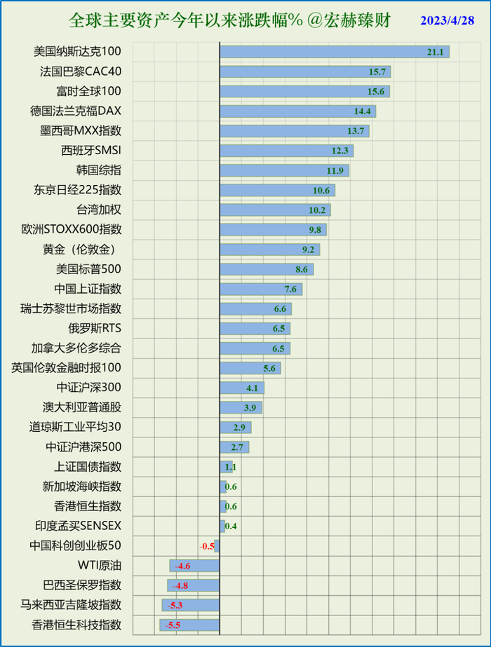 各类资产今年以来涨幅前三:美国创业板、法国、富时全球