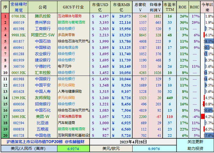 2022年末三甲:腾讯2.85万亿、茅台2.17万亿、阿里1.63万亿人民币;