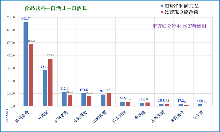 净利润TTM三强:贵州茅台663亿、五粮液284亿、泸州老窖112亿。