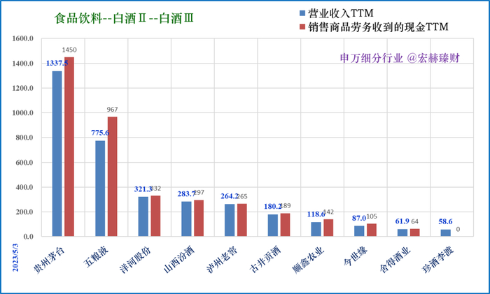 营收TTM三强:贵州茅台1338亿、五粮液776亿、洋河股份321亿。