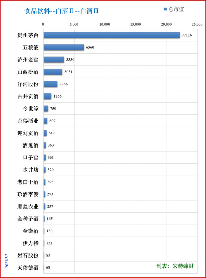 总市值前三:贵州茅台2.21万亿、五粮液6560亿、泸州老窖3330亿。