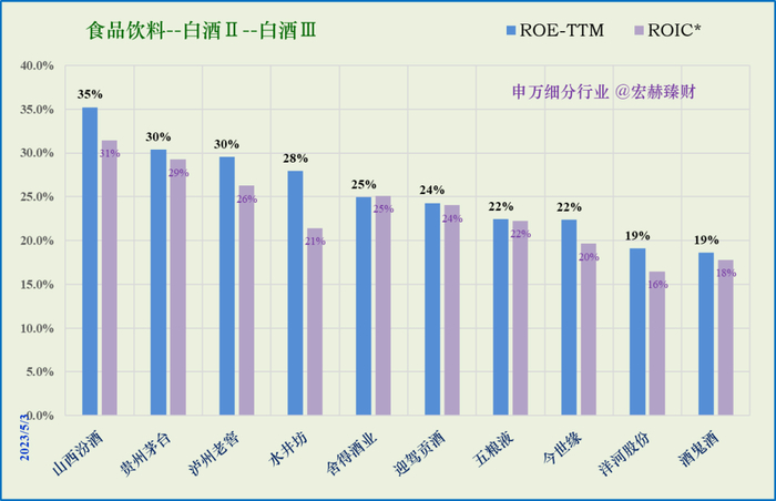当前时点净资产收益率TTM三强:山西汾酒、贵州茅台、泸州老窖