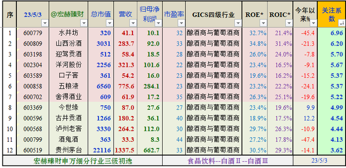 初选2:固定财务指标异常值剔除&复活:从毛利率、净利率,总资产周转率,净债务率,应收账款/营收,净利润含金量以及ROE和ROIC进一步提升标准等固定量化指标,剔除或复活非常态公司,胜出公司【12】家。按照宏赫关注系数排序如下: