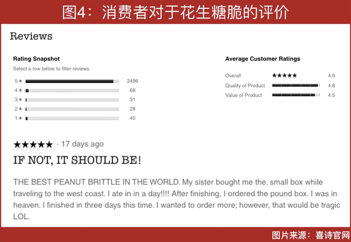 好的产品品质也换回了消费者的喜爱,在近期购买过花生糖的消费者中,有2496位给出了5星好评,产品评分高达4.9,高于官网上大多数同类产品。少量差评则主要来自于产品碎裂、包装不佳等方面。