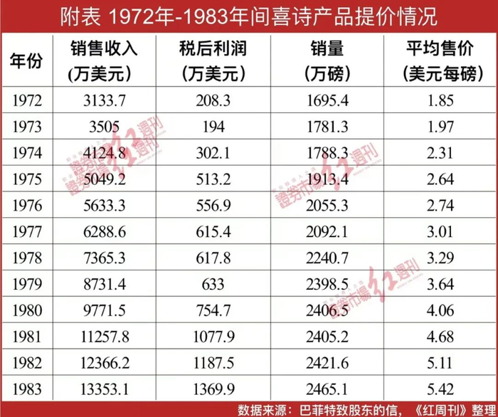 2007年致股东的信中,巴菲特称喜诗为“梦幻的商业模式”,他提到,喜诗的销售额从1972年收购时的1695万磅增长到了2007年的3100万磅,年均增幅仅为2%,但是凭借喜诗家族在几十年间建立的深厚品牌优势和专业经营者的加持,喜诗糖果为伯克希尔带来了丰厚的利润。