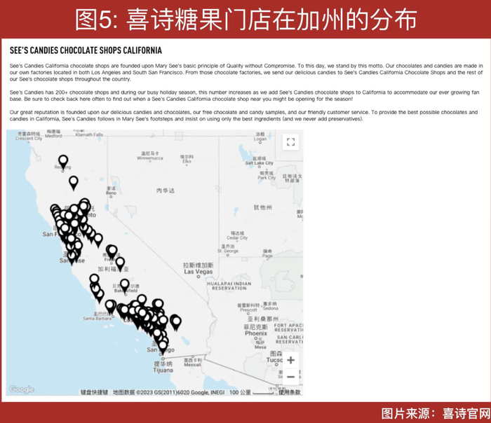 实际上,在巧克力、糖果领域,喜诗目前并非是全球闻名遐迩的知名企业,尤其在中国,知名度并不及歌帝梵、吉利莲等品牌,但在加州,喜诗却做到了家喻户晓,在喜诗糖果全世界250家门店(2022年伯克希尔财报数据)中,有153家坐落在加利福尼亚州,并且据其官网介绍,在节日旺季,公司还会在加州适量增加季节性门店。