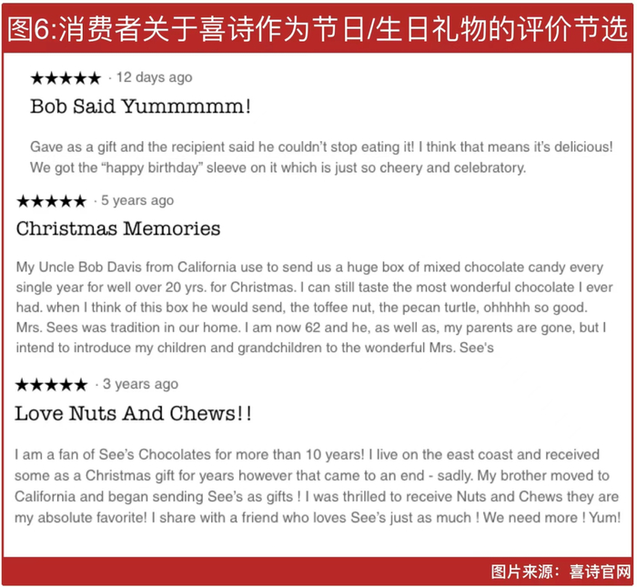 这从其官网评论也可见一斑。在最受欢迎的糖果和巧克力产品下,大量消费者评论都与家人、圣诞节、礼物有关,可以说在加州,喜诗糖果就代表着节日和分享。