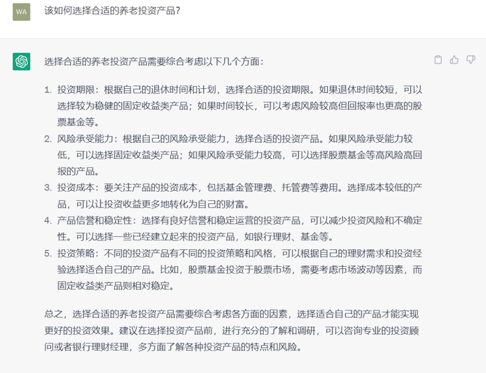 提到养老投资理财,首先要关注的是:如何选择合适的养老投资品?ChatGPT的回答遵循了“知己知彼”的原则。一方面,要“知己”,了解资金的投资期限和自己的风险承受力;另一方面,要“知彼”,了解产品的投资成本、产品信誉和稳定性、投资策略等。