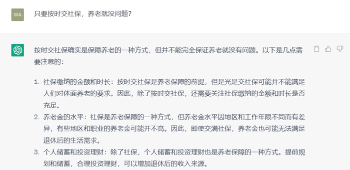 很多人的认知中,为养老所做的最好准备就是“缴纳社保”。那么,是不是只要按时交社保,养老就没问题了呢?ChatGPT的回答直接且清晰:按时交社保确实是保障养老的一种方式,但并不能完全保证养老就没有问题。一方面,要关注社保缴纳的金额和时长;另一方面,即使交满社保,养老金也可能无法满足退休后的生活所需。