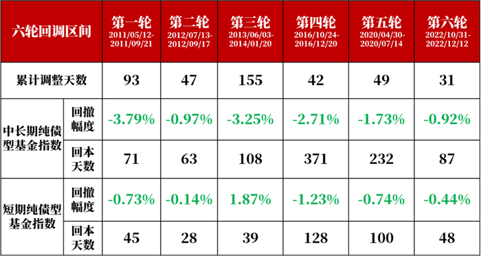 通过回顾历史数据,债市每隔2-3年往往出现一次较大回撤,2011年以来共出现6次,中长期纯债基金指数历史最大回撤3.79%,最大调整天数为155天。