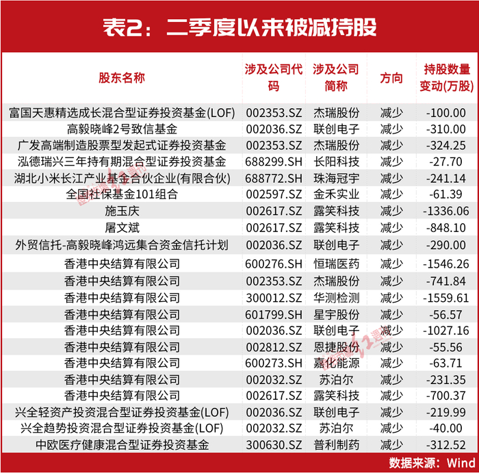 而在朱少醒、郑澄然之外,仍有多位知名投资者在今年二季度以来对相关公司选择了减持操作,如葛兰减持了普利制药312.52万股,高毅资产的明星基金经理邓晓峰旗下的高毅晓峰2号致信减持了联创电子310.00万股,“夫妻档”牛散施玉庆和屠文斌合计减持了露笑科技2184.16万股……(见表2)