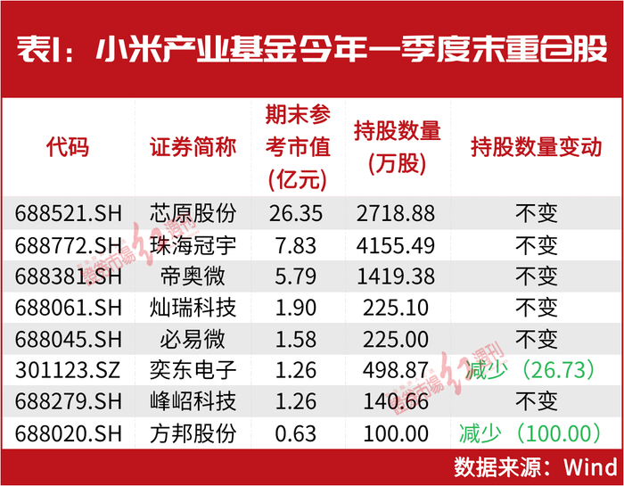 需要注意的是,小米产业基金在今年一季度末还重仓持有芯原股份、帝奥微和灿瑞科技等多家上市公司(见表1),对于相关公司后续是否也会被减持我们也将持续关注。