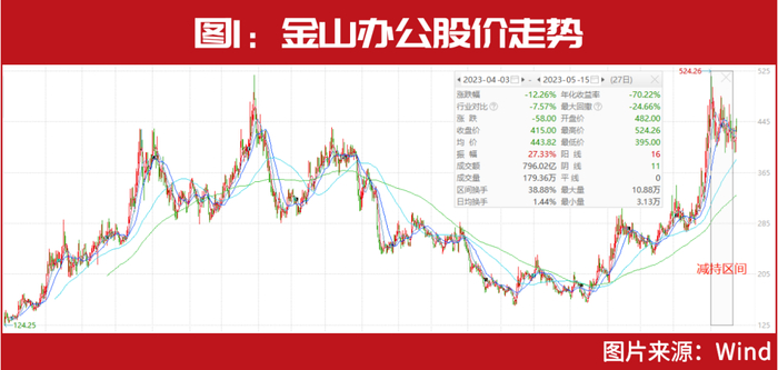 在此期间,WPS香港和奇文N维的持股市值均明显扩容。作为国产办公软件龙头,金山办公一经上市便备受主力资金青睐,其股价也由100元/股不断向上突破,尤其是在近一段时间的AI风口刺激下,金山办公盘中最高更是触及524.26元/股的历史高点(见图1)。其中,WPS香港持股市值也由最初公开的398.28亿元增至1149.39亿元。雷军在此时出手,“收割胜利果实”的迹象明显。