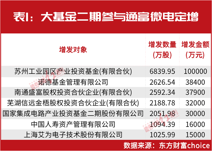 曾于2022年11月,通富微电增发18419.97万股、募资总额26.93亿元的定增落地。大基金二期当时耗资30000万元认购了公司2051.98万股股份(见表1)。