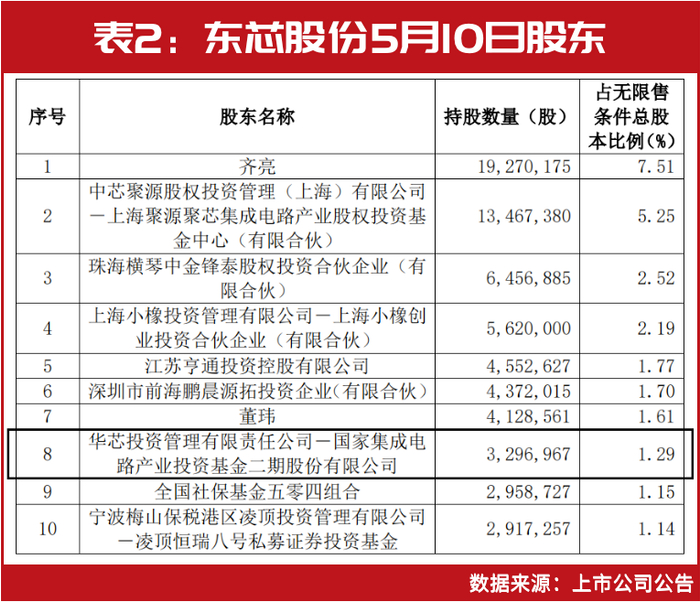 在东芯股份披露的截至5月10日的前十大无限售条件股东持股中,大基金二期以329.69万股的持仓量位列其中(见表2),且以新进姿态成为第8大流通股股东。