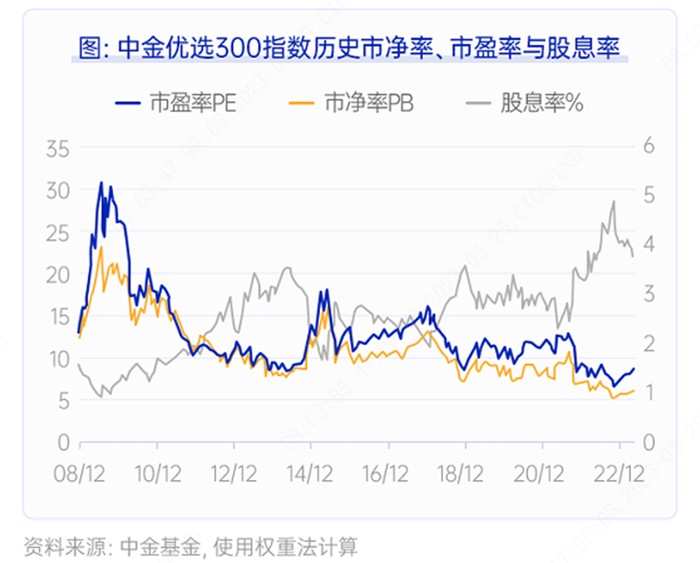 中金优选300在选股方面注重投资标的的不断优化以及风险的分散,中金优选300指数成分股每年5月和11月调整一次,同时单个股票权重上限为5%,能有效分散个股风险。指数估值指标均处于历史较低位置附近,向上有一定的修复空间。