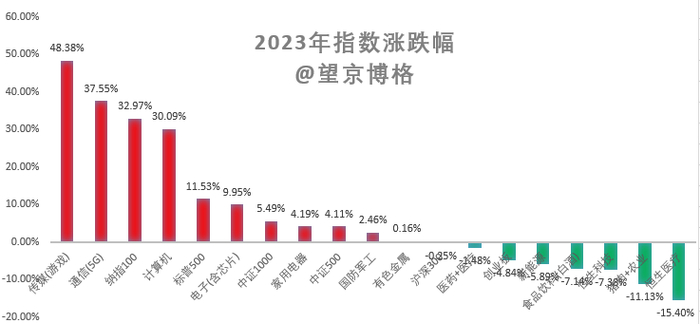 2023年涨幅最多的依次是传媒(游戏)、通信(5G)、纳指100、计算机(信创)、标普500、电子(芯片)等。