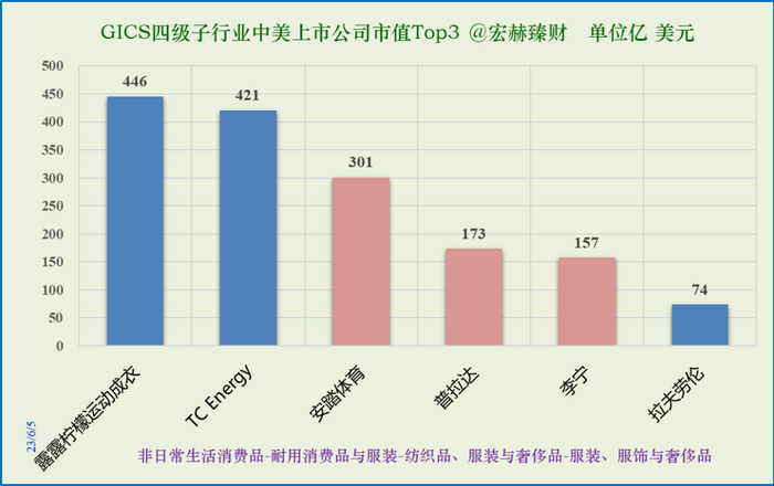 其中按注册地分露露柠檬运动衣和拉夫劳伦为美国企业;TC Energy为加拿大企业;普拉达为意大利企业;安踏和李宁为注册地在开曼群岛的中国主体业务企业。
