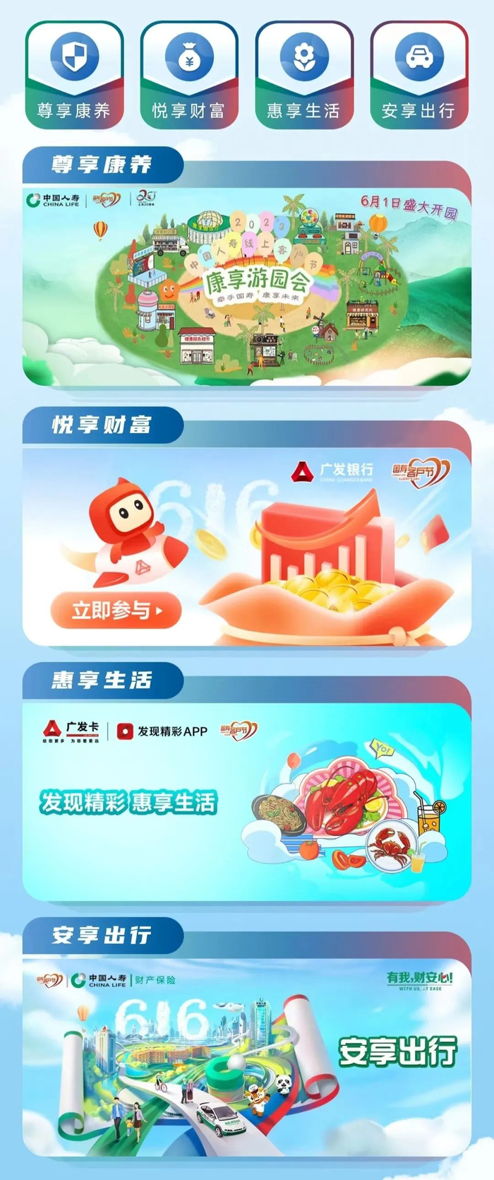 其中,“尊享康养”以中国人寿寿险APP为主,聚焦提供客户健康养老等产品服务,开展多样化服务体验和趣味互动活动。“悦享财富”以广发银行APP为主,聚焦满足客户投资理财、财富增值等需求,推出各类优势产品和权益活动。“惠享生活”以广发银行发现精彩APP为主,聚焦满足客户高品质生活需求,开展多种消费优惠和特色信用卡联动活动等。“安享出行”以中国人寿财险公司安心享平台为主,聚焦满足客户出行用车、商旅生活需求,推出权益升级和直播互动等活动。