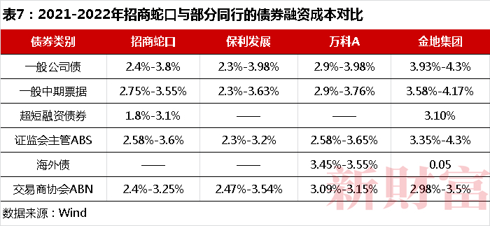Wind数据显示(表7),2021-2022年,在“招保万金”阵营中,招商蛇口的债券融资成本已明显低于金地集团、万科A,与保利发展旗鼓相当。而同样作为央企背景的地产公司,招商蛇口在公司债、中期票据、交易商协会ABN等产品上的票面利率上限,略低于保利发展。