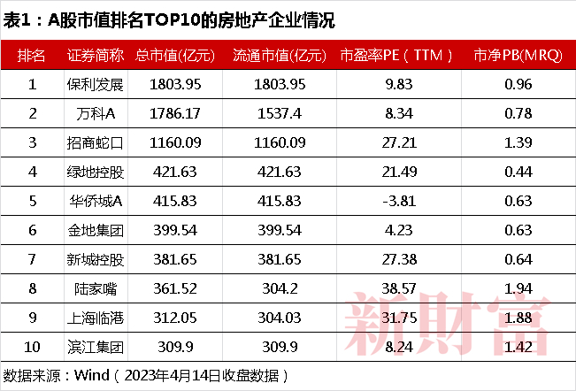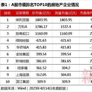 Wind数据显示,截至2023年4月14日收盘,保利发展、万科A、招商蛇口市值位于A股房地产板块市值前三甲,且稳定在千亿元量级,金地集团(600383)则以近400亿元位居第六位(表1)。