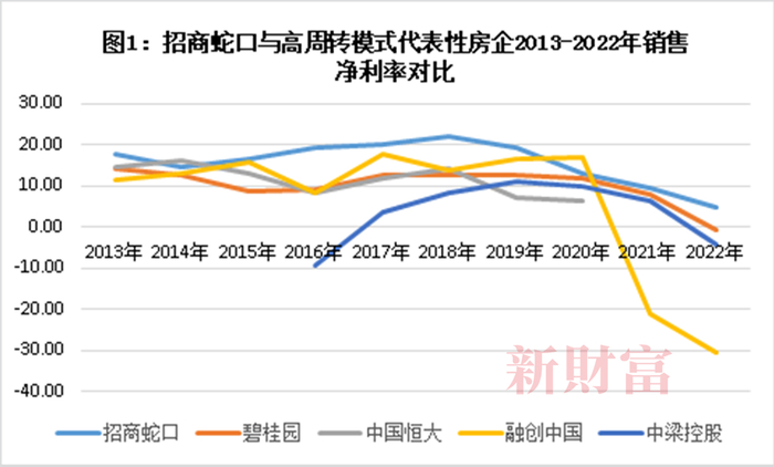 房地产行业,碧桂园、中国恒大、融创中国、中梁控股(02772.HK)是“高周转模式”的代表。2013-2022年,招商蛇口的销售净利润率长期稳居4家房企之上(图1)。这或意味着,招商蛇口的产品在销售市场中更具竞争力,以产品品质为内核的发展逻辑,奠定其持续领跑市场的基础。
