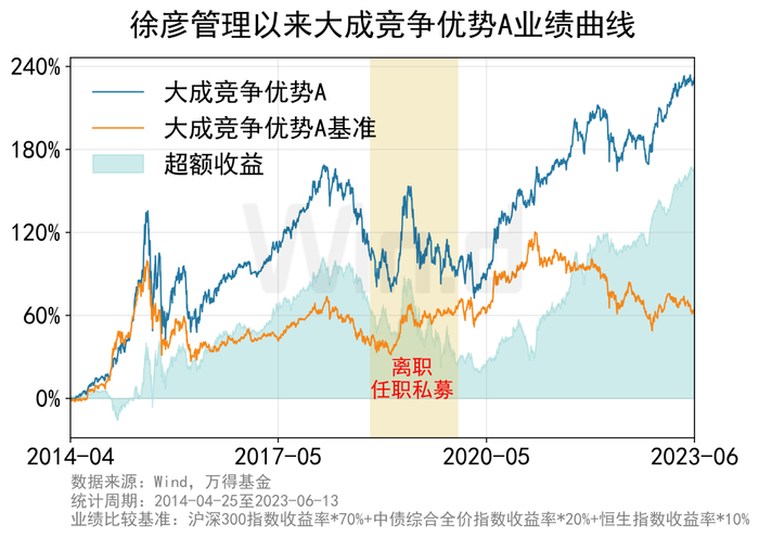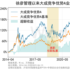 大成竞争优势A是徐彦的代表作之一,自2014年4月25日开始管理,期间于2018年9月12日至2019年12月29日就职私募短暂离任,2019年12月30日再度管理该基金至今(2023年6月13日)。徐彦管理期间,大成竞争优势年化收益率超17%,而最大回撤比同类平均低超10个百分点。