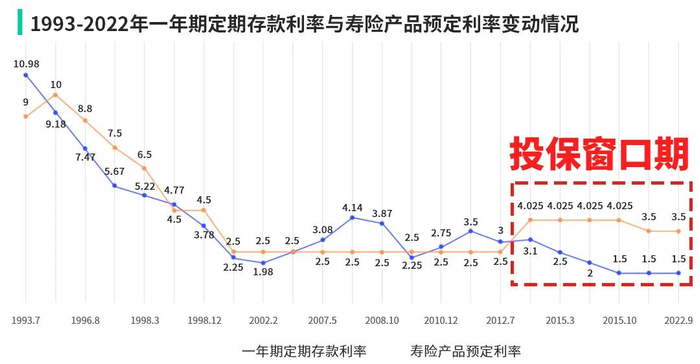 很多人看不上 3.5% 的收益,以为只要自己想买,随时都能买到。但如果我们回头看 2018 年,4.025% 收益的年金险,确实是错过就没有了。收益 3.5% 的增额终身寿也是一样,6月底也将全面下架,机会一去不复返。近 30 年来,银行的存款利率和储蓄险利率整个大趋势就是一路下降:
