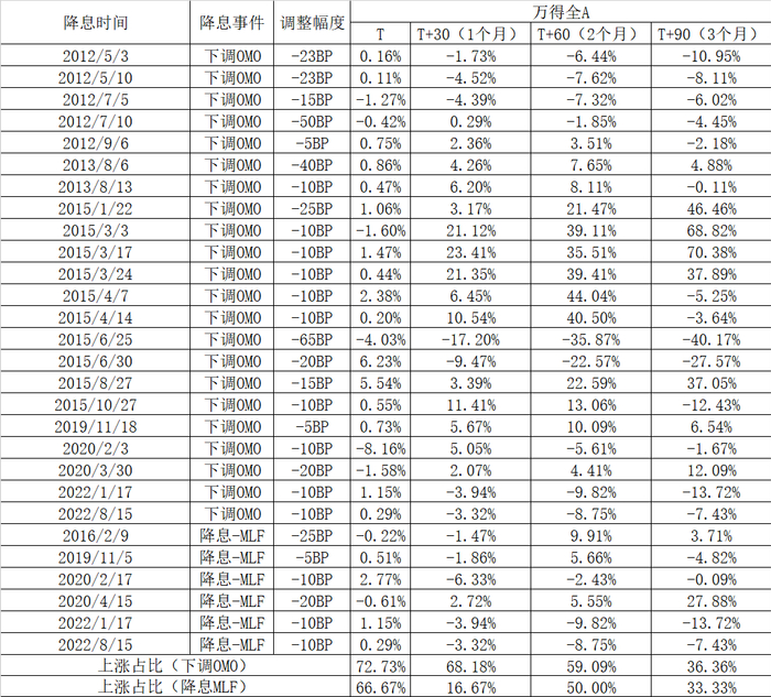 比较自2012年降息后A股市场的短期及中期表现: