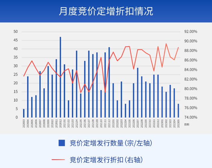 解读:2023年5月定增项目发行数量季节性回落,据Wind已披露数据,当月仅发行8宗定增项目,或导致月度定增折扣有一定程度收敛。伴随着影响定增项目发行节奏的因素逐步消除,定增市场有望将恢复正常发行节奏,折扣空间或将同步回归常态