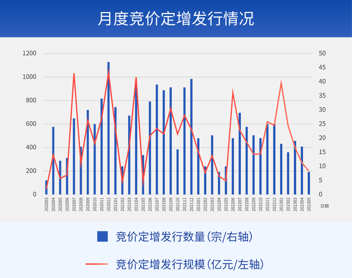 不固定影响因素方面,我们认为主要是市场环境。如果市场环境特别有利或不利于项目发行,都会对上市公司启动发行及投资者意愿造成直接影响。例如根据Wind数据,2023年4月底到5月份虽然市场指数下跌幅度不大,但是很多个股都处于持续下跌的过程,投资者态度谨慎,如果上市公司贸然启动发行,会导致定增锁定折扣减少,进一步打压投资者意愿,从而对项目发行造成难度。因此大多定增项目或会等待市场企稳,待上市公司及投资者之间重新找到平衡点后启动发行