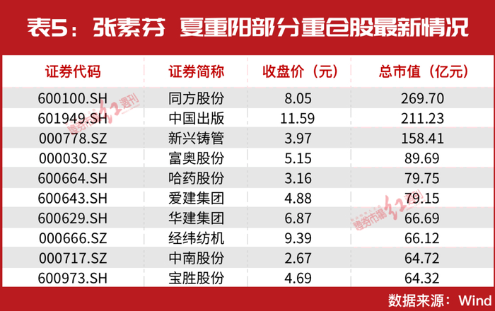 具体到公司层面,张素芬和夏重阳比较喜欢重仓低价、小盘股。如这38家,其目前的最新收盘价有37只在10元以下,仅中国出版在11.59元/股;其目前的最新市值有35只在100亿元以下,仅同方股份、中国出版和新兴铸管在150亿元~300亿元区间(见表5)。