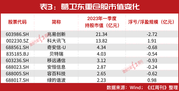 作为期货、股票“双修”的大佬,葛卫东在具体的投资上也别具一格。如在今年一季度末的重仓股中,既有人工智能龙头科大讯飞,也有新能源电池正极高镍三元龙头容百科技等,整体持仓涵盖了AI和新能源两大领域(见表3)。但综合这些公司二季度末以来的市场表现来看,葛卫东整体浮亏近3亿元。