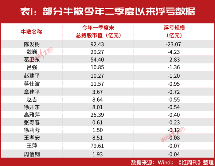 以今年一季度末持股市值居前且知名的21位牛散为样本,以其重仓股至今的市场表现进行测算,相比以往,众多知名牛散在二季度大面积产生了浮亏,多至数十亿,少则几千万。其中,“牛散之王”陈发树、“东邪”葛卫东等均在其列,纷纷败北。
