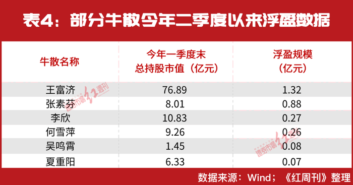 当然,也有部分牛散获得了胜利,重仓股在今年二季度以来产生了一定的浮盈,王富济就是其中之一(见表4)。
