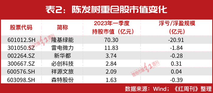 在今年一季度末,陈发树共出现在6家上市公司的前十大流通股东名单,其中持股市值最高的是隆基绿能,但也正是隆基绿能让陈发树产生了较大的浮亏(见表2)。