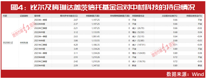 “中字头”公司中材科技则长期得到了美国前首富比尔·盖茨的青睐,自2020年二季度末至今年一季度末,比尔及梅琳达盖茨信托基金会始终位居公司前十大股东之列(见图4)。