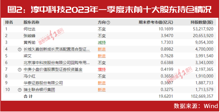 如淳中科技,2022年四季度,由丘栋荣管理的中庚价值先锋股票型基金以新进姿态出现在公司前十大股东阵营,且今年一季度,其持仓又再度增持了102.53万股(见图2)。