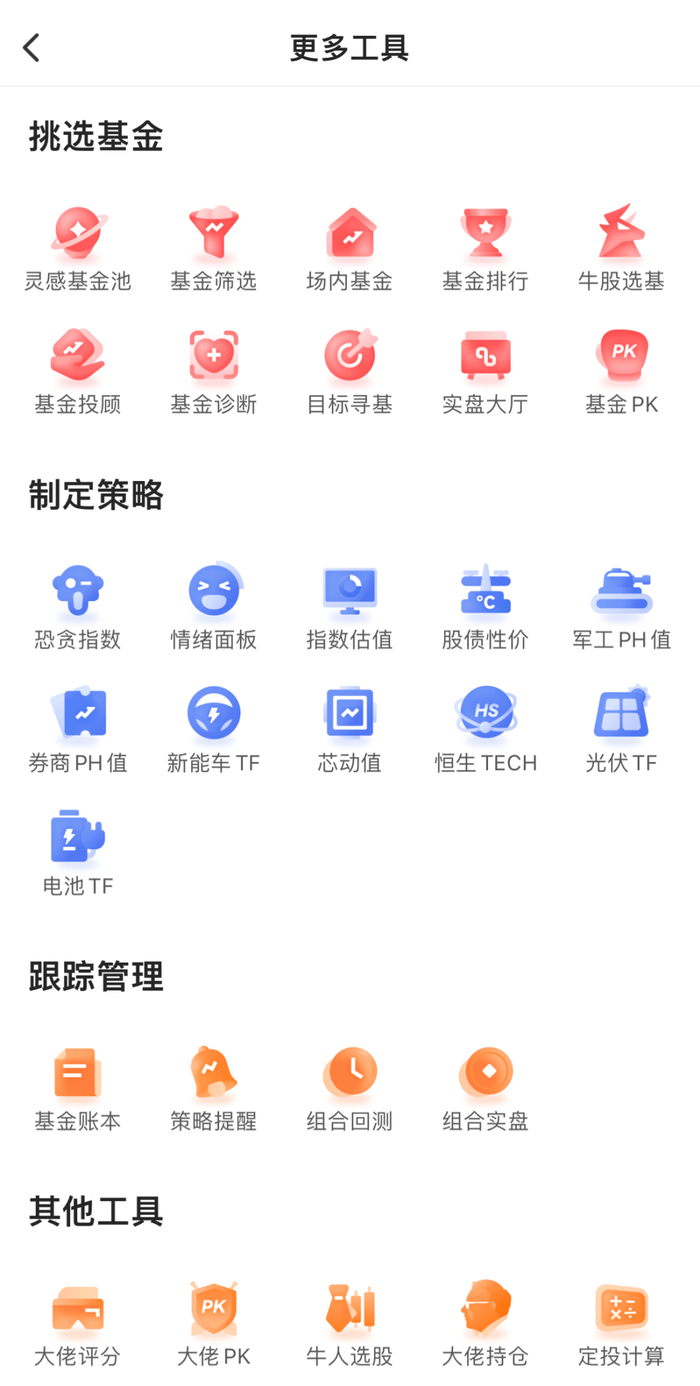 由此,我们梳理了“选基 - 策略 - 管理”这条路,多方位全链路给大家提供信息参考,App的功能也是服务于这条链路,现在的界面呈现,也是更专注于投资里:
