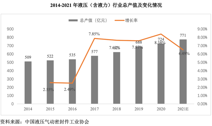 此后,我国液压行业步入相对稳定增长阶段,行业工业总产值从2015年的522亿元增长到2020年的724亿元,年均复合增长率达到6.76%。2021年,我国液压工业总产值预计已经达到771亿元。
