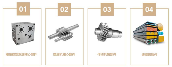 目前主要产品包括转子、液压阀块、导向套等,可广泛应用于空压设备、工程机械、注塑设备、传动装备等行业领域。