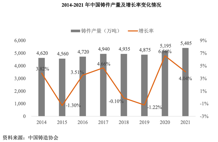 中国铸造协会数据显示,2021年受下游主机行业的带动,我国铸件总产量达到5,405万吨,同比增长4.04%,2014-2021年复合增长率为2.27%,总体保持增长态势。