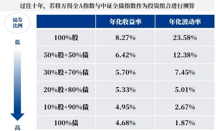 近10年数据回测,假设投资组合以不同比例投资于股票资产(万得全A指数为例)和债券资产(中证全债指数),“30%股+70%债”相较“100%股”,收益降低2.57%,波动降低16.13%,“10%股+90%债”相较“100%股”,收益降低3.32%,波动降低20.91%,呈现出较为明确分层的风险收益特征,以供投资者根据常态风险立场进行考量。